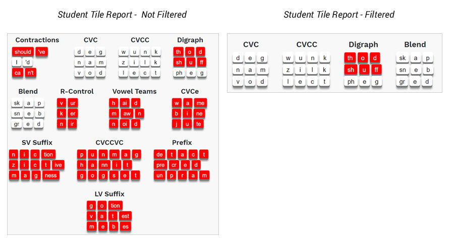 The Student Tile Report and Student Bar Graph, when not filtered, display all 12 categories and 36 words, regardless of how many categories and words you choose to use. When the category filter is applied, the report will exclude the categories and words designated with a “Not Taught” label.