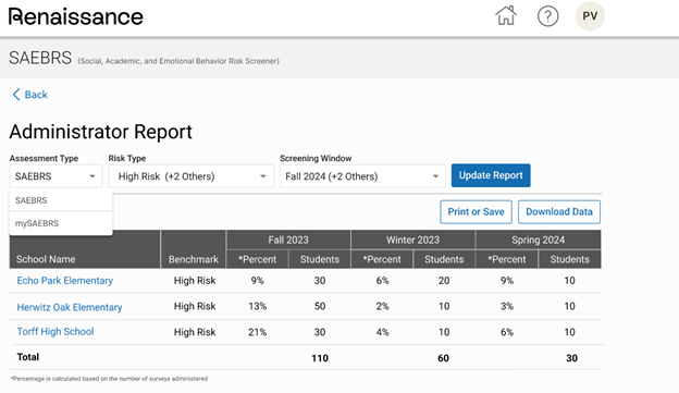 Administrators have the option (as shown below) to choose SAEBRS, to gain deeper insight about students, based on teachers’ observations, or mySAEBRS, based on students’ self-assessment responses.