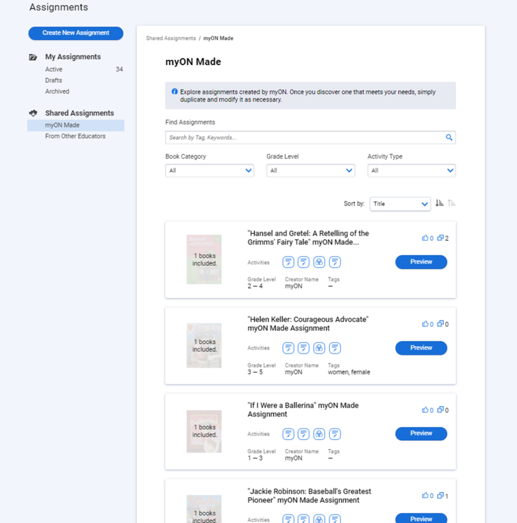 Continue reading to learn more about the Assignment Creator and myON Made Assignments.