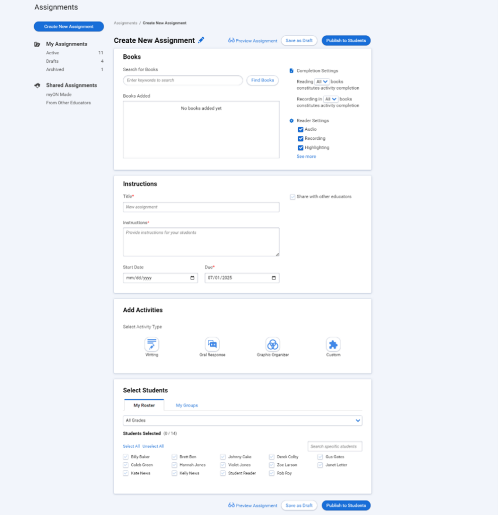 We are excited to introduce a new Assignment Creator and ready-to-use “myON Made” assignments to help teachers build students’ literacy skills aligned with the Science of Reading and more closely connect work on myON to classroom instruction. These new features provide a streamlined way for teachers to create and deliver assignments, recommend personalized and authentic reading material, and monitor progress all while improving students’ reading comprehension skills.