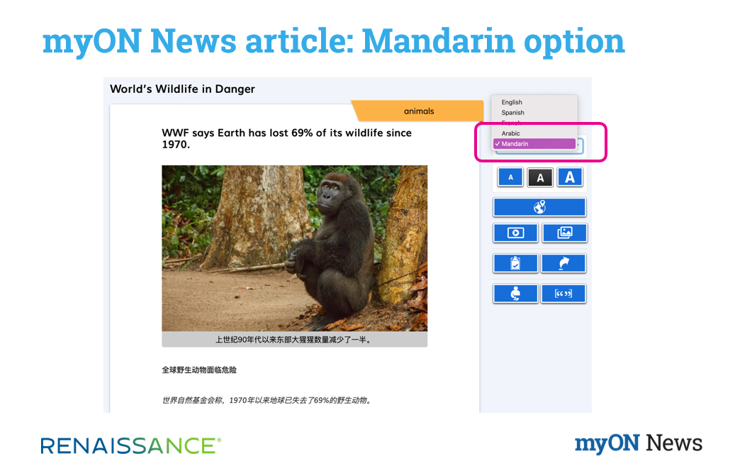 In addition to English, Spanish, and French, myON News articles are now being translated into Arabic and Mandarin as well. A new dropdown menu has been added to the article settings for students to select which language they want to read the article in, as shown below. Students also have the ability to listen to articles in the new languages being read aloud by native speakers.